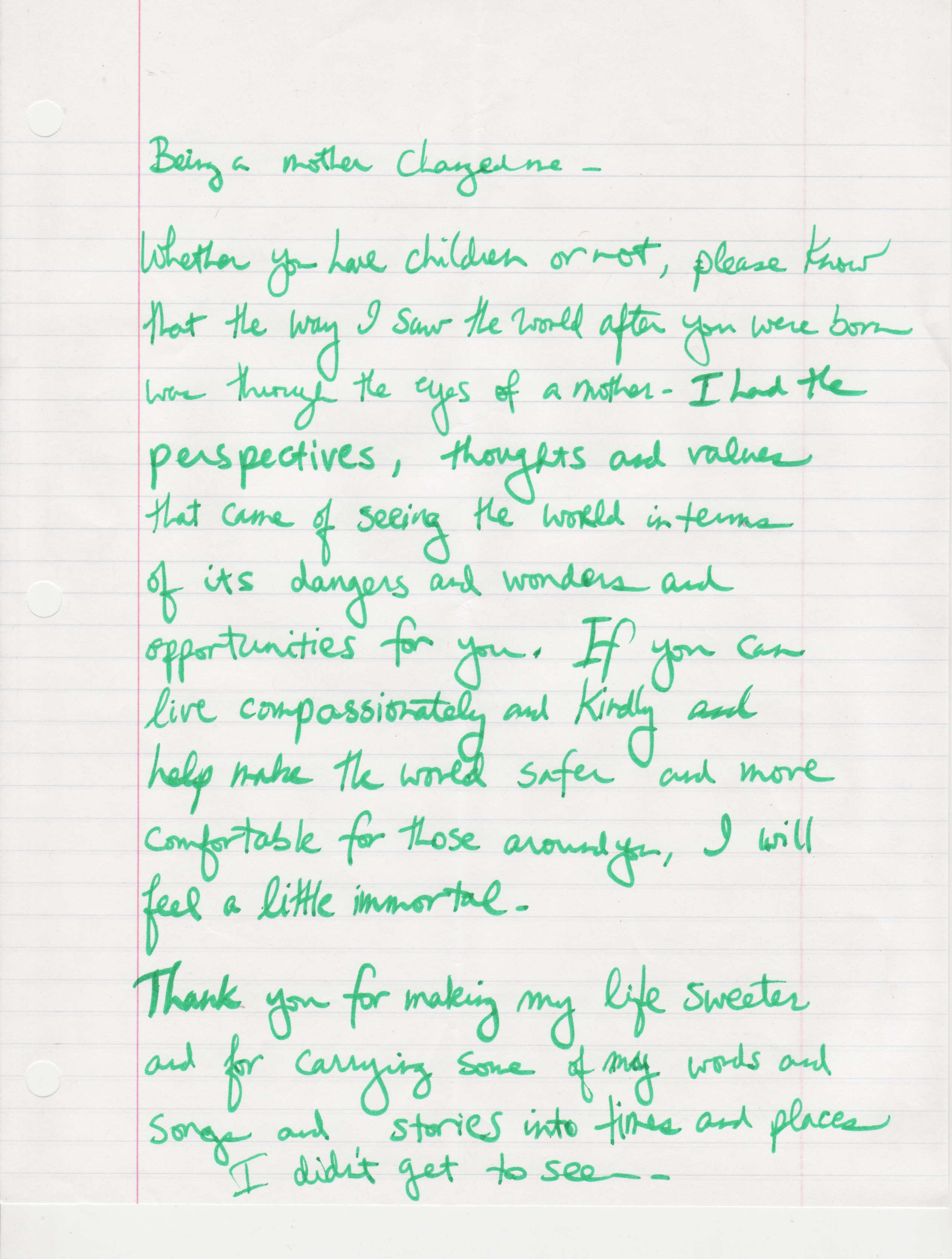 Being a mother changed me. Whether you have children or not, please know that the way I saw the world after you were born was through the eyes of a mother. I had the perspectives, thoughts and values that came of seeing the world in terms of its dangers and wonders and opportunities for you. If you can live compassionately and kindly and help make the world safer and more comfortable for those around you, I will feel a little immortal. Thank you for making my life sweeter and for carrying some of my words and songs and stories into times and places I didn't get to see. |