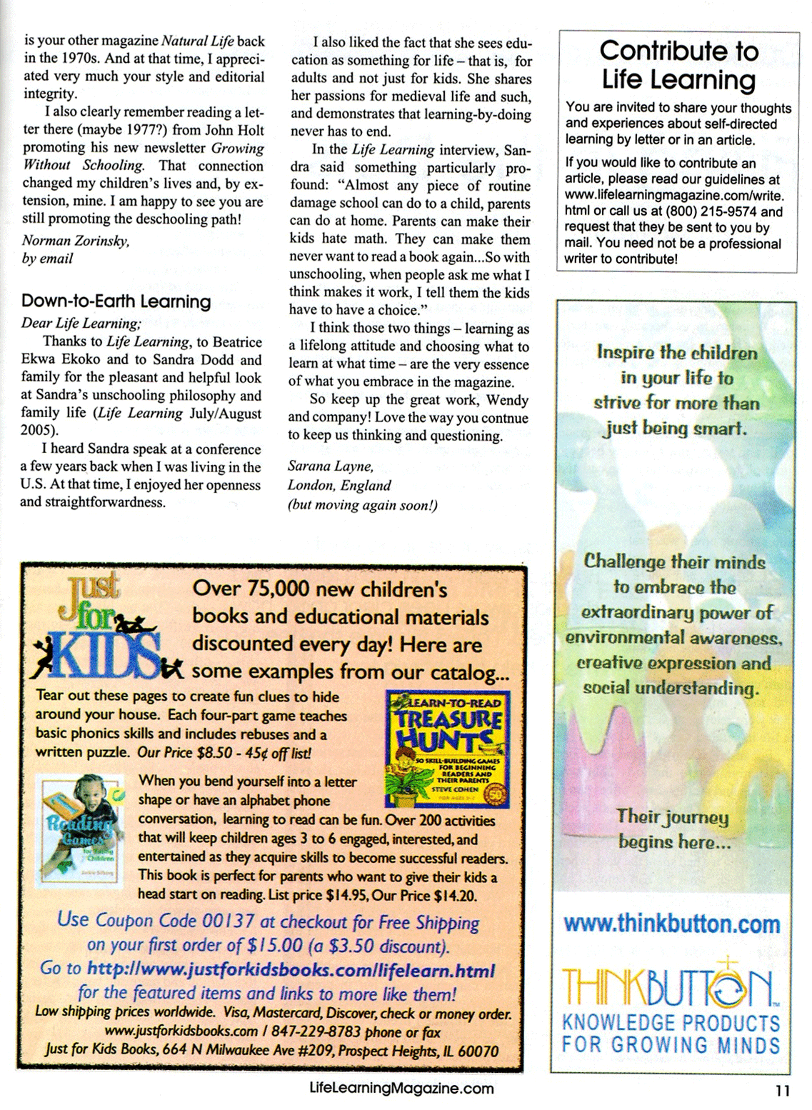 I finally had a chance last night to listen to the radio show you did and LOVED it (I've been forwarding the link to all my friends and relatives!). It's not only wonderfully wise, but you have such a nice voice...very soothing and convincing....just right to help my dh 'get' radical unschooling even better :)