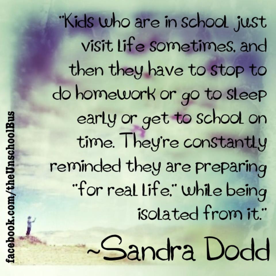 Kids who are in school just visit life sometimes, and then they have to stop to do homework or go to sleep early or get to school on time. They're constantly reminded they are preparing "for real life," while being isolated from it. —Sandra Dodd (original, 2004)