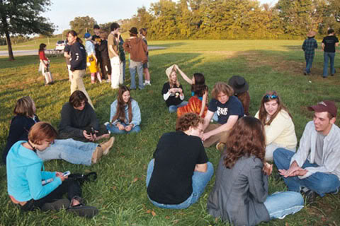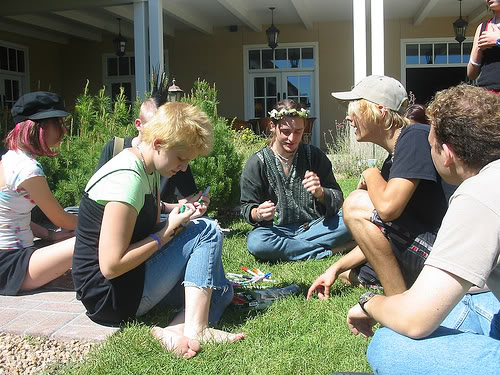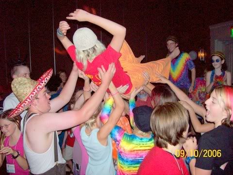 Below is a 2006 photo by Gail Higgins, of kids at the dance at the Live and Learn Unschooling Conference, held in Albuquerque that year. That's Holly aloft, and Marty in the hat.