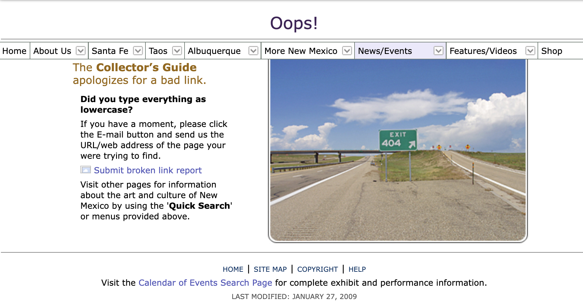The New Mexico Collector's Guide site was bought or transferred to an artist's network. But when it was the Collector's Guide, they had a New Mexico freeway exit photo for their 404 page. Beautiful!