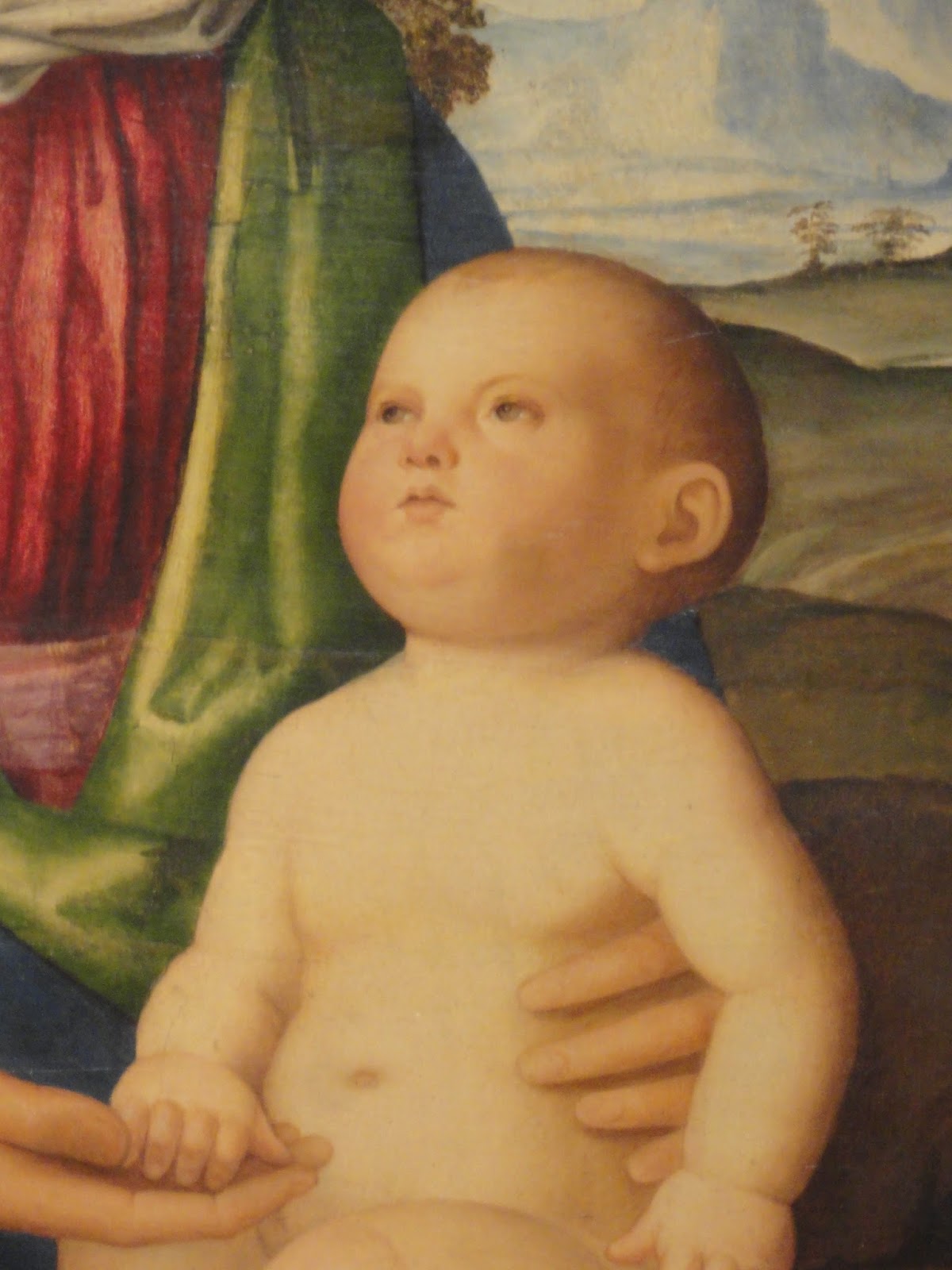 I found another infant by the same artist, and it's not good. Looks like the head and body weren't painted as a set. The baby's butt is bigger than his head, and the face is too small. Maybe the artist hadn't been around many actual babies, whose heads are relatively huge.Babies' hands reach from their chins to their noses (butt of palm on chin, top of longest finger nose-ish). Adults' hands reach from chin to forehead (on their own faces).
