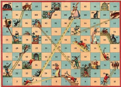 Thanks for your web page! I found it by chance as my husband and I were trying to find an on-line snake and ladder game. It was a great surprise for me as I recognised the snake and ladder board I used to play with twenty years ago when I was a child: the sleds and toboggans. Actually, this board had belonged to my great-grand-mother, and had been kept since then by my grand-mother. As a 10-year-old child, I marvelled at the thought I was playing with a game my great-grand mother used to play with at the beginning of the century!