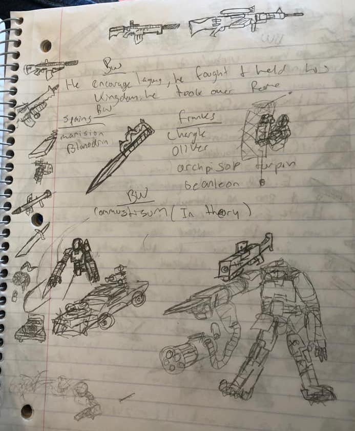 "Bo, could you do me a couple of pieces of kid-art? In the style of an 8th grader doodling in a notebook, could you do me something like a knife dripping blood (color on the blood would be cool, especially if it looked like it had been colored with a colored pencil or a red-ink pen!) and maybe a tank firing?Bo outdid my expectations with all kinds of boy-doodles. Females in the viewership who had no brothers or sons might not appreciate this as much as male-related folk, but I hope they stir some memories and awareness in all who come by this page."If only I had saved some art from when I taught Jr. High English!!! It was everywhere in those rooms."
