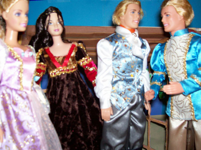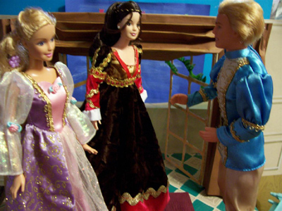 Over and over she would request the story of “Romeo and Juliet”. She was very interested in the fact that it had been a play, and then a ballet. We read a bit of the play, but that was less interesting than hearing me retell the story. We watched a bit of the Norma Shearer movie version, although Jayn’s appreciation of black and white movies is yet to emerge. What really excited her was “Shakespeare in Love”. She had me play their portrayal of the death scene over and over, and was also very interested in the Queen. Jayn often notices references to “R & J” in other movies, particularly balcony scenes – she calls it “making a joke on Romeo and Juliet”. She also had a sticker book with a representation of another Juliet Barbie doll (non-ballet), so she had me make a rendition for a dancer of the same costume (see the photos). We got to see the real thing at the convention, and make a comparison.