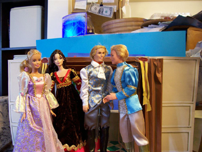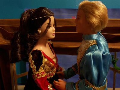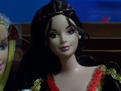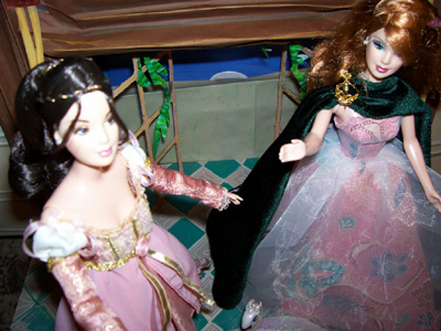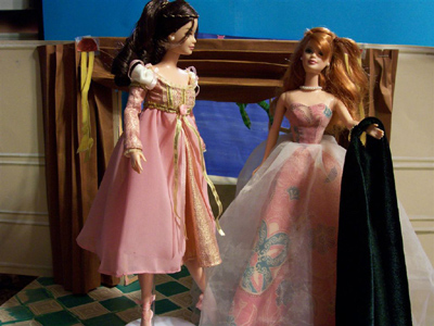 Some time last year, Jayn chose a very pretty collectible Barbie from the Mattel factory store, the Juliet ballerina depicting the ballet of “Romeo and Juliet.” She is a very pretty doll, finely detailed, delicately made up, and one of the rare en pointe foot sculpts. Clearly she is dressed in her nightgown, and the box depicts her posed before the French doors leading to her balcony.