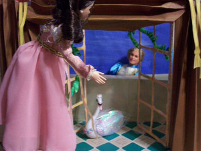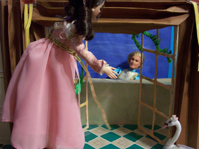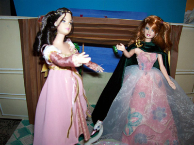 The very beautiful box art was one of the first inspirations leading Jayn into the world of creating backgrounds for her dolls to be posed and photographed in. She asked for my assistance in recreating the scene, and the faults of scale in the finished work are entirely mine in this, my first attempt. Meanwhile the box blurb was an introduction to the story, and Jayn was immediately interested.