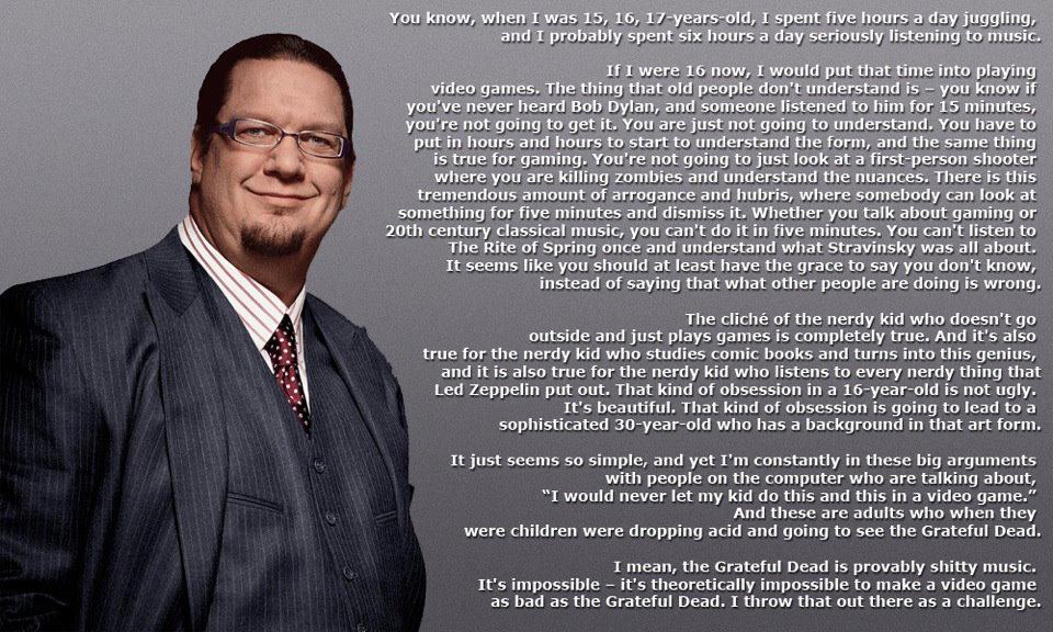 This image was going around Facebook in April 2011. I'll credit the creator of the image if anyone knows whose it was originally. The quote is from this interview: Penn Jillette Is Tired Of The Video Game Bulls***