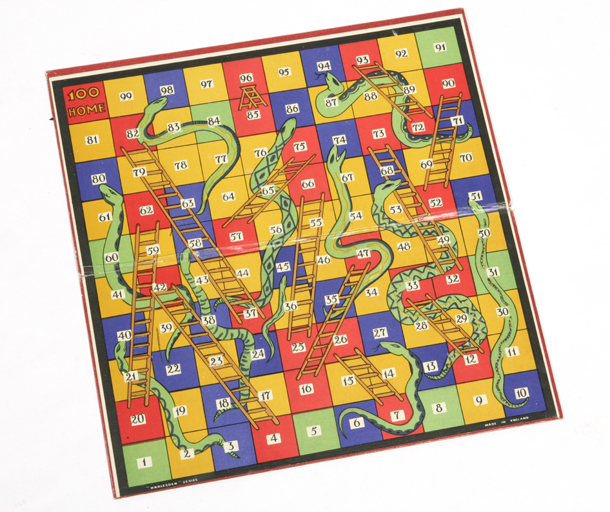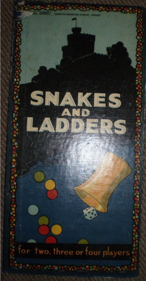 I am sending you a photo of a snakes and ladders game that I own. From the type of materials used to make the board I don't think it is older than around 1970 but I do love the graphics because they are probably a reproduction of an original board which to me looks likes a style from the 1920's or 1930's. On the back it looks like the game parcheesi but there are no marks or writing to indicate who made the board or when.