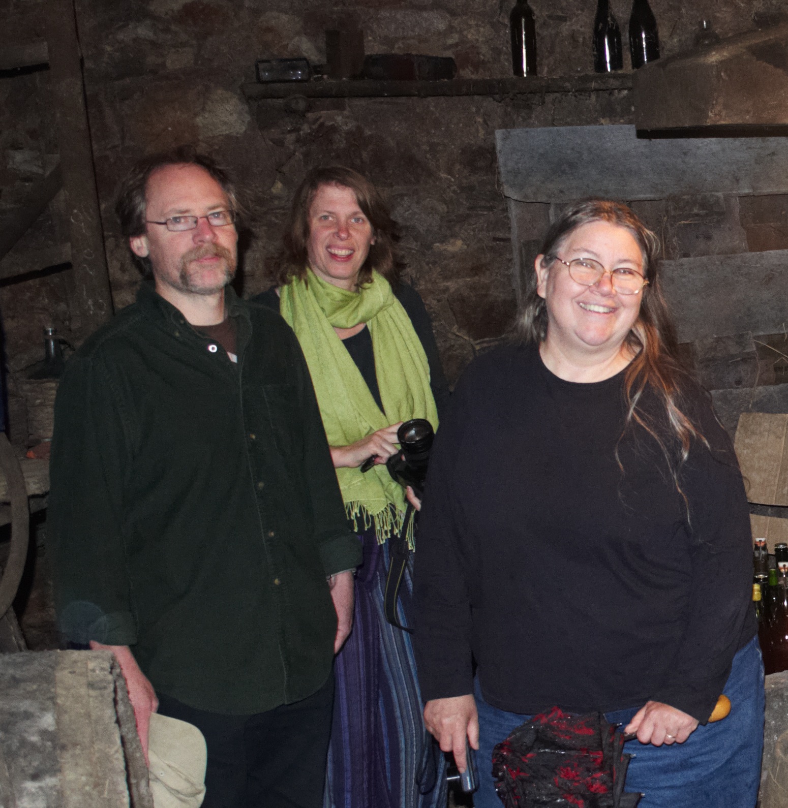 The top photo is by Sandra Dodd, taken in Hennebont, in Brittany, in 2011. The black and white is by Schuyler. The other three photos were taken by our host in France, Leon McNeill. In the last one, of David, Schuyler and me, we were being shown an old but still operational cider press at their next-door-neighbor's house in Baud. Click it for the larger image with more of the building and equipment. (When that one loads, you can click it for another enlargement.)