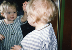 My own children are shown in some of the images below, but here's a link to something about the benefits of children growing up in a home with big mirrors, and it has photos of kids with their reflections. Mirror Mirror on the Wall by Ronit Baras